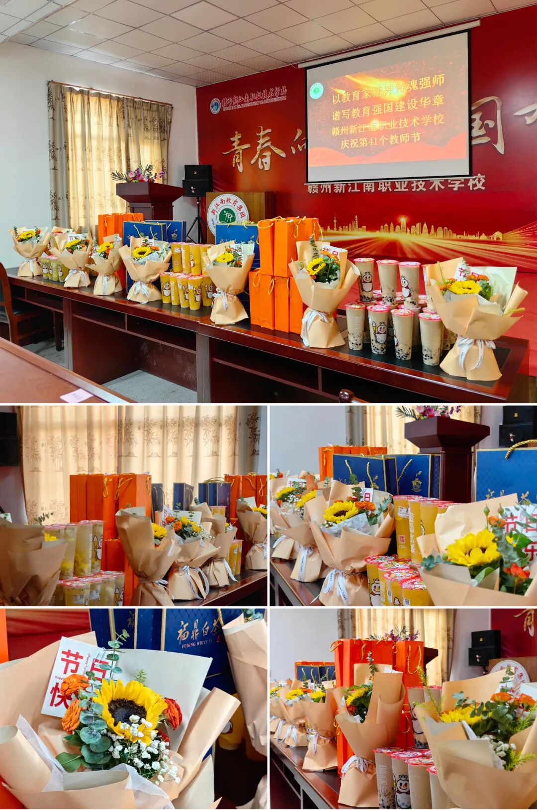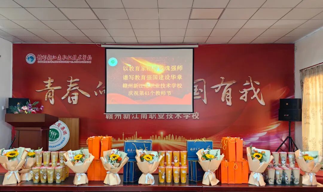 9月10日,新江南教育集团隆重举行“以教育家精神铸魂强师 谱写教育强国建设华章”庆祝第41个教师节大会。新江南教育集团董事长、新江南职业技术学校校长刘世芳、新江南教育集团副董事长杨美红、新江南职业技术学校副校长赵佳艳、副校长余艳平、副校长冯李平等行政班子、全体教师及学生代表齐聚一堂,共同庆祝这个属于教育工作者的光荣节日。大会由集团办公室主任颜克兰主持。