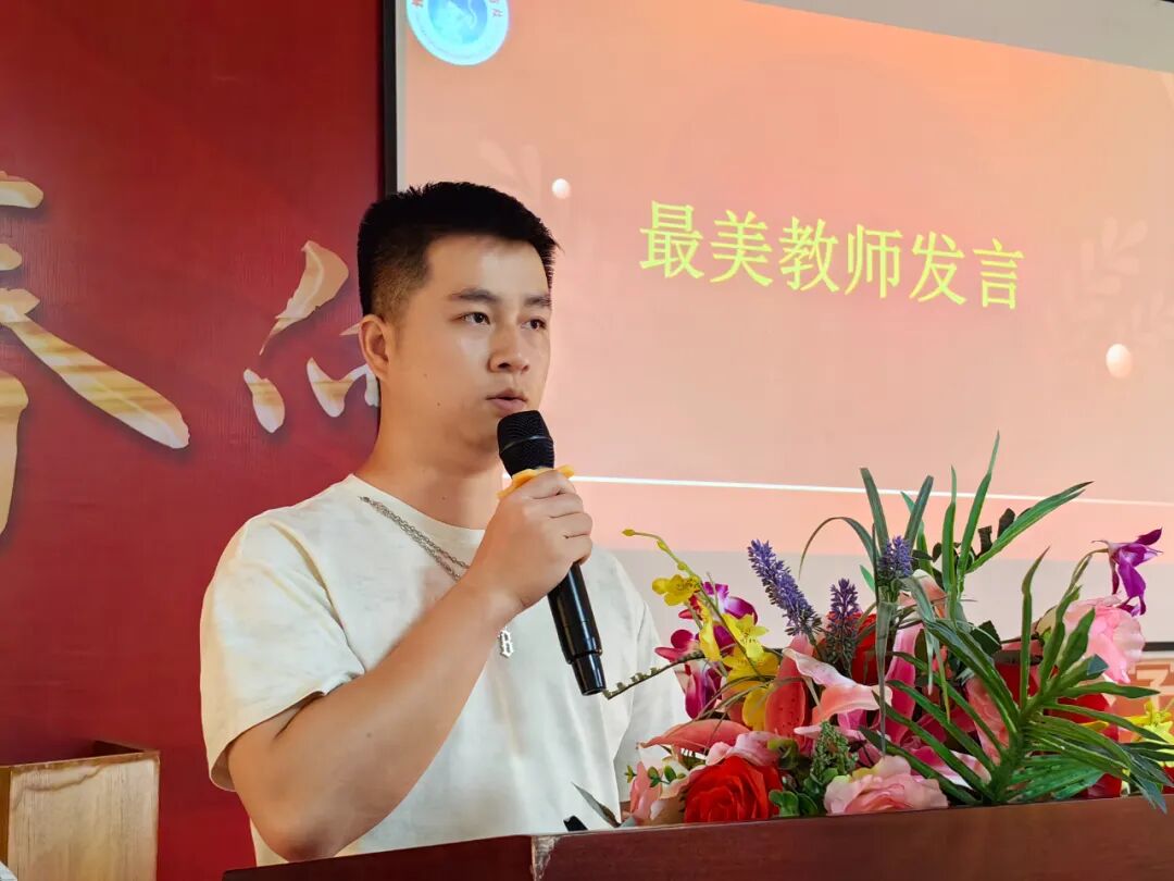 表彰仪式后,荣获“最美教师” 刘吉凡老师作为代表上台发言。他分享了自己的教育经历和心得感悟,他表示,这份荣誉是肯定也是鞭策,在今后的工作中,将继续以教育家精神为指引,不断提升自己,为学生的成长和教育事业的发展贡献更多力量。