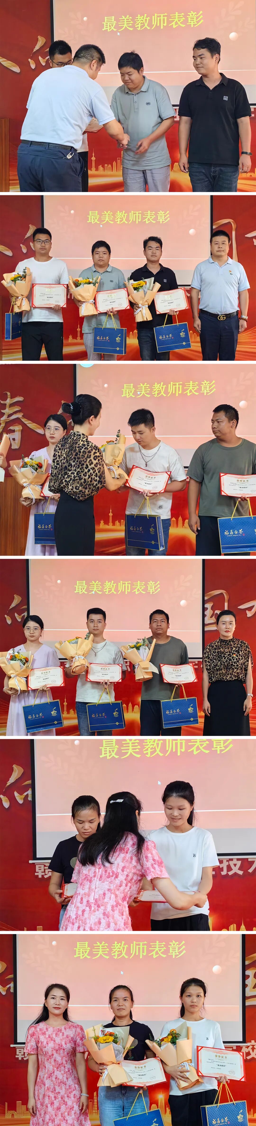 接下来是备受瞩目的 “最美教师” 表彰仪式。由新江南职业技术学校副校长赵佳艳宣读“最美教师”表彰名单,集团董事长、新江南职业技术学校校长刘世芳、集团副董事长杨美红、新江南职业技术学校副校长赵佳艳依次为荣获 “最美教师” 称号的老师们颁发荣誉证书和奖品。这些老师在教学、育人等方面表现突出,他们用爱心、耐心和责任心诠释着教师的真谛,是全体教师学习的榜样。