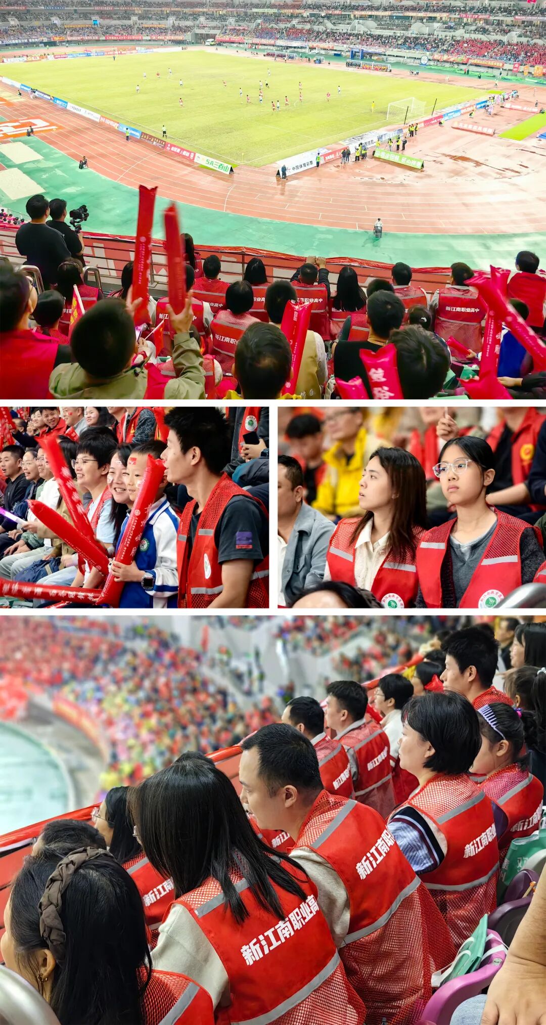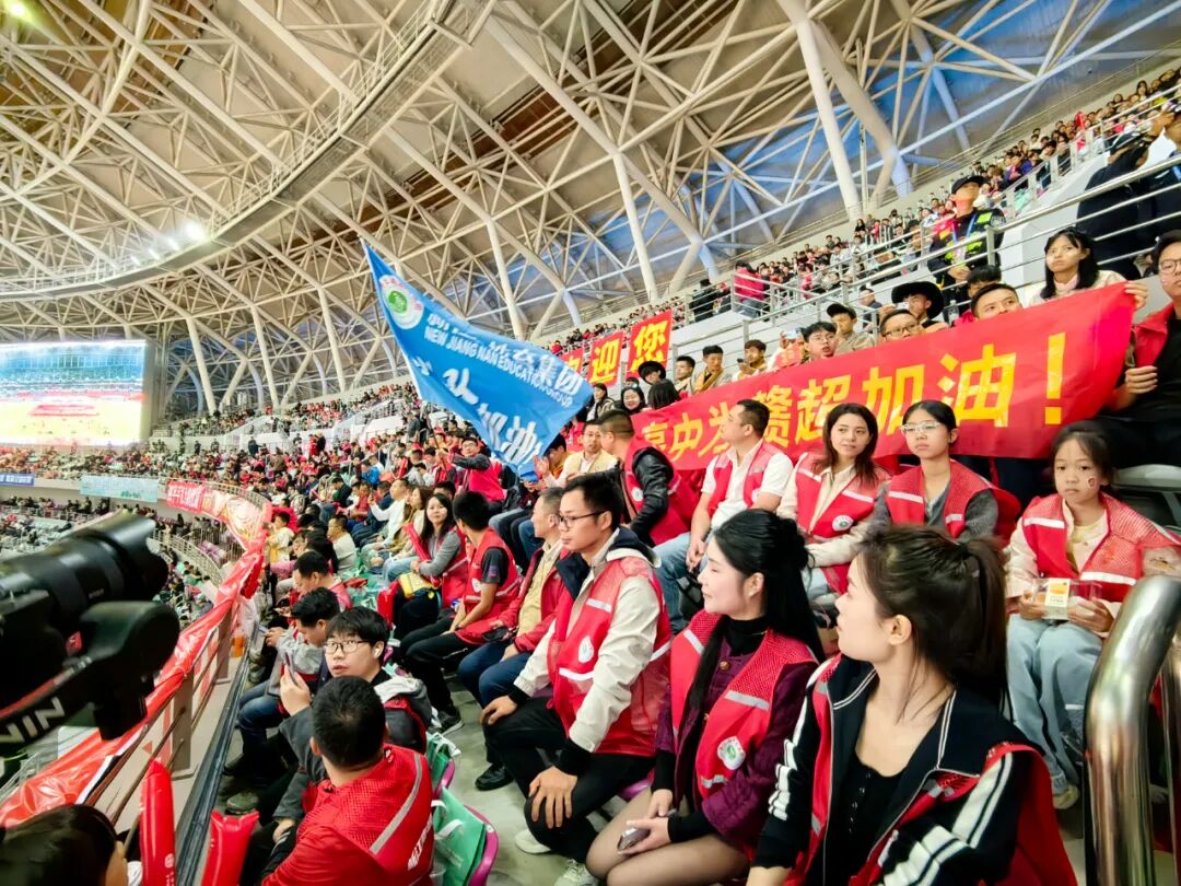 现场师生们身穿统一服装,挥舞旗帜,以激昂的呐喊声展现出对球队的热爱与支持。